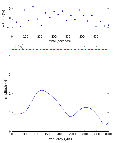 An important aspect of Fourier analysis is separating signals of interest from the noise. Time series measurements will each have some random measurement errors. If this noise is uncorrelated and similar throughout the data set, the contribution of noise to the periodogram will be a noise floor of peaks distributed across all sampled frequencies. The peaks will follow some distribution (\(\chi^2\) with two degrees of freedom if the noise is Gaussian) that falls off exponentially to high amplitude, so it’s unlikely for the noise in your data set to produce a peak that is “very tall.” A very tall peak is more likely to represent a real signal, and we might interpret peaks that rise above some significance threshold in the periodogram to be real signals we wish to analyze. Where to set such a threshold depends on your data and the problem at hand. Often it is defined as some factor above the average peak height (noise level; \(\langle A\rangle\)) in the periodogram. For demonstration purposes, these examples show a threshold four times above the average amplitude in the periodogram, 4\(\langle A\rangle\).
